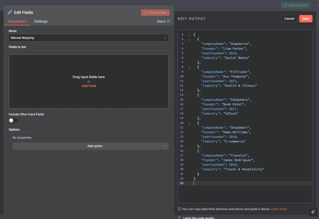 Sometimes, when building or testing workflows in n8n, you just need some dummy data to work with. Instead of waiting for an external API or database, you can quickly generate mock JSON inside n8n using the Edit Fields node. From there, the Convert to File node allows you to transform that JSON into a structured Excel (XLSX) file that you can download and share.