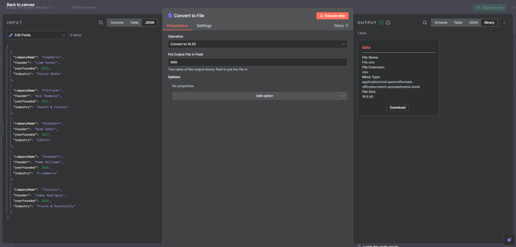 At this point, n8n knows to take the structured JSON you created and turn it into an actual file.