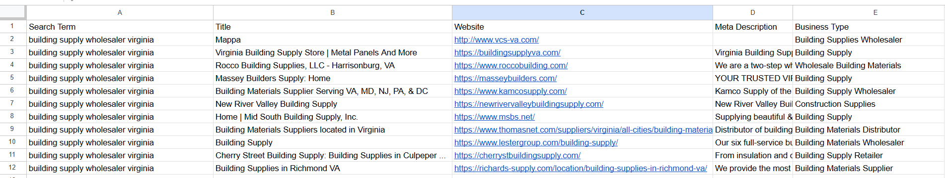 The output Google Sheet has columns for: search term, page title, website URL, meta description, and AI-generated business type classification. This gives your sales team everything they need to quickly evaluate each result without ever leaving the spreadsheet.