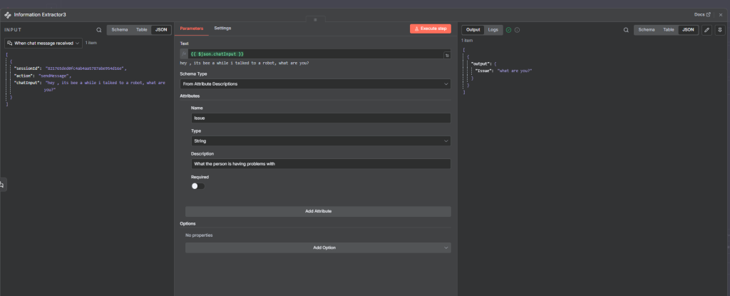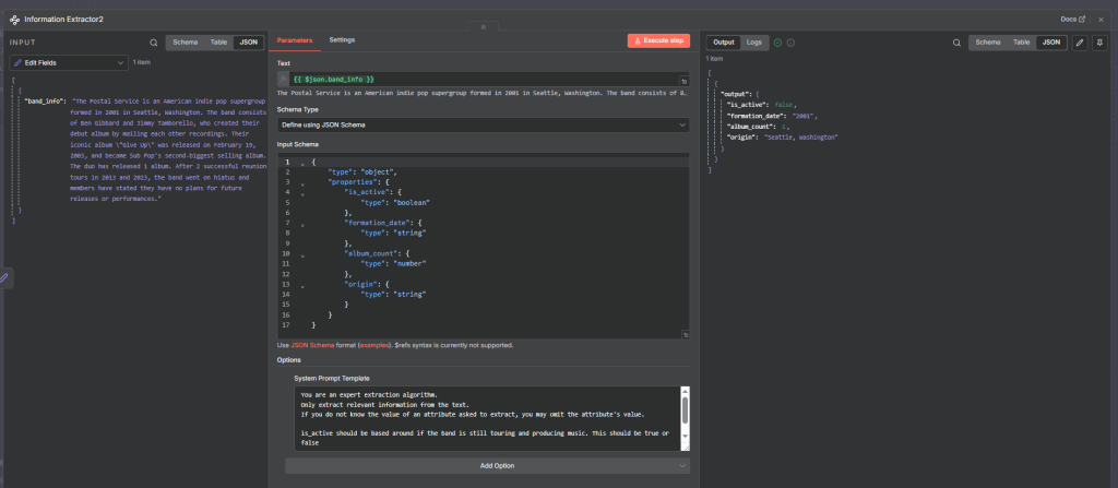 The Information Extractor is a tool that transforms unstructured or semi-structured data into clean, structured formats like JSON. It can process text, chat inputs, or binary data (once converted to text) and automatically identify key attributes, values, and types. With built-in prompts, schema support, and a JSON output parser, it eliminates the need for a separate AI agent, making data extraction fast, consistent, and reliable.