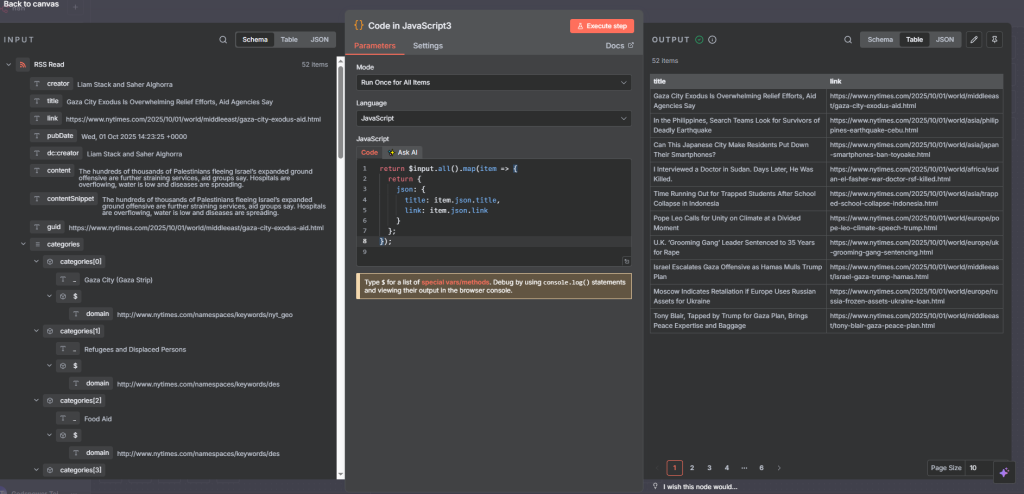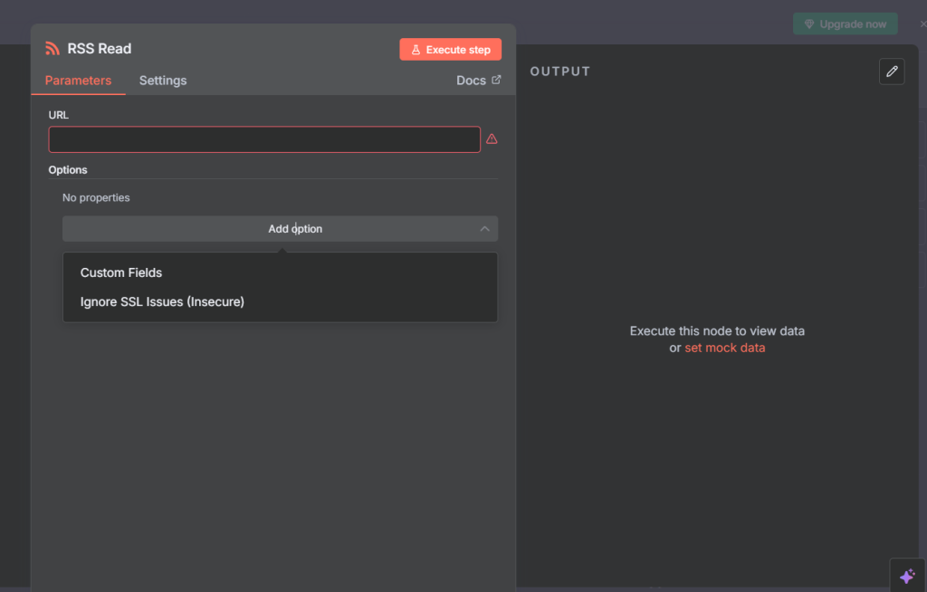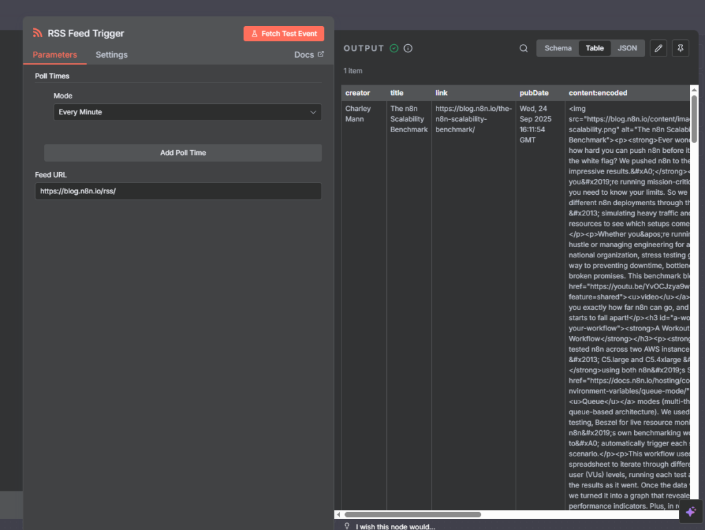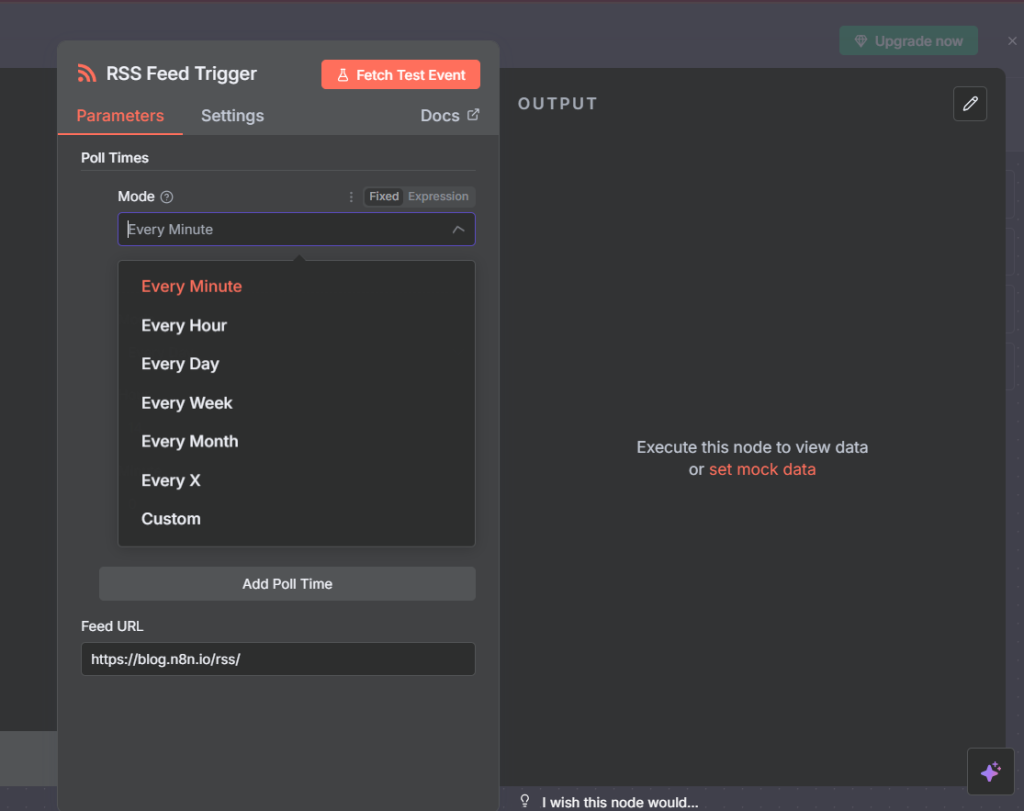 pubDatemay cause duplicates/missed items.Read nodes: fetch all items every time. For recurring checks, you must dedupe manually (e.g., store GUIDs/links in a database).