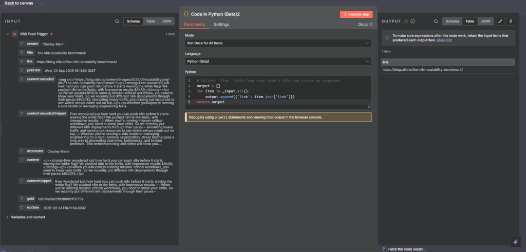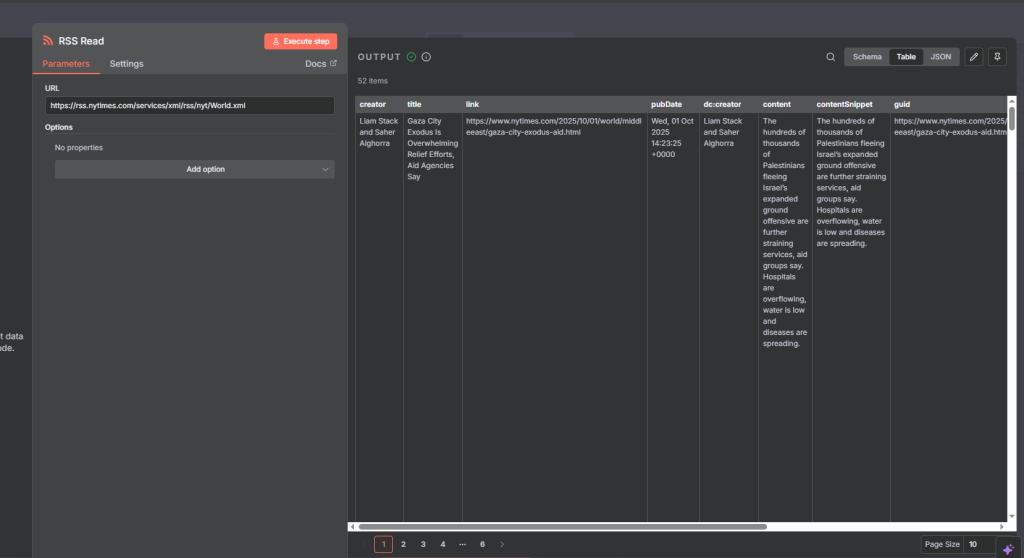 Output — Returns an array of items (title, link, content, published date, etc.).