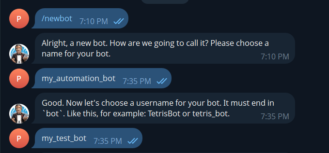 Type /newbot (or click the command link). BotFather will ask for a display name (what users see) and a username (must end in ‘bot’, like my_automation_bot). After confirming both, BotFather will give you the bot’s API token.