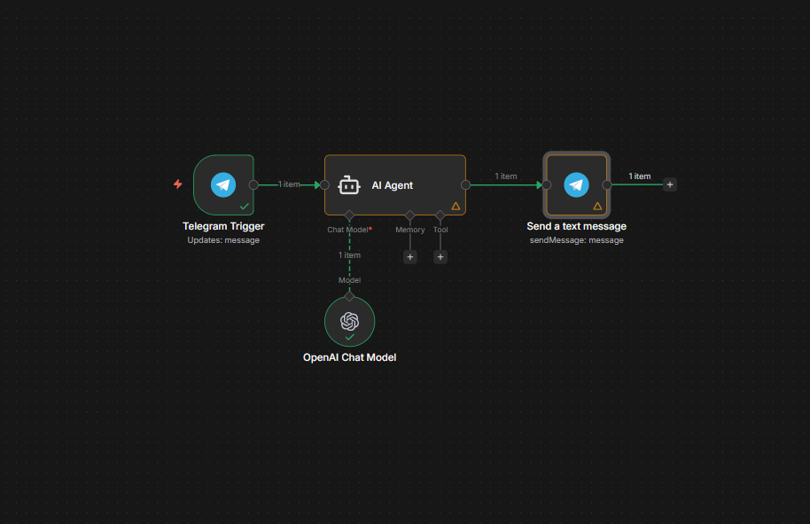 Node setup (n8n telegram node send message example): n8n telegram send message node workflow — Telegram Trigger (On Message) → AI Agent (with the user’s message as input) → Telegram: Send Text Message (with the AI agent output and the Chat ID from the trigger).