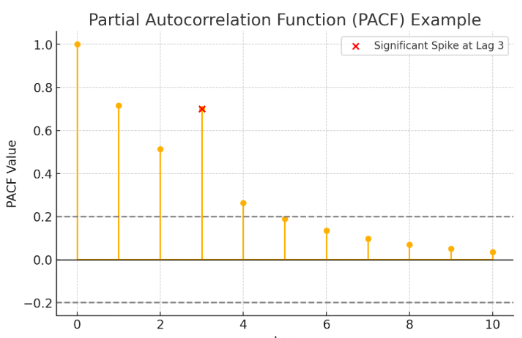 For example, if the PACF shows a significant spike at lag 3, it means that y(t) is significantly correlated with y(t−3) , even after accounting for the influence of lags 1 and 2.