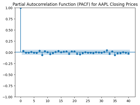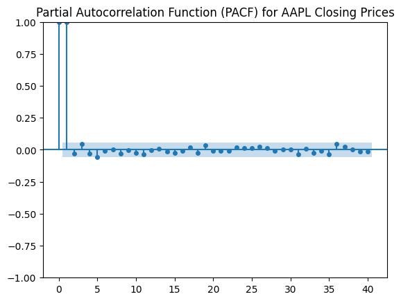 plt.title("Partial Autocorrelation Function (PACF) for AAPL Closing Prices")