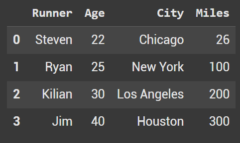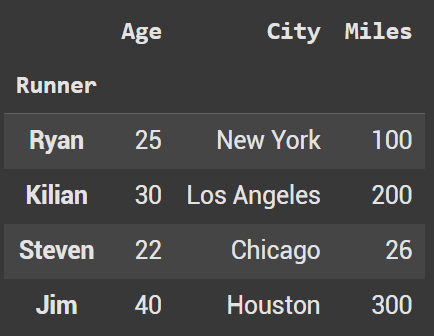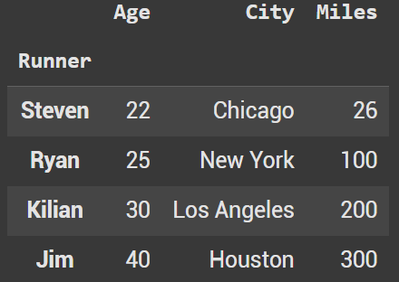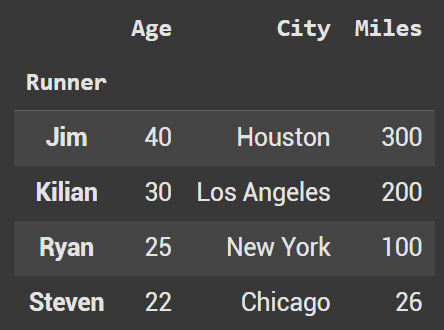 The dataframe we are utilizing is based around runners, their age, and then the city and miles of races.