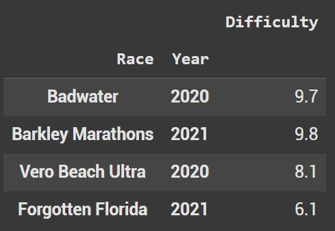 'Race': ['Badwater', 'Barkley Marathons', 'Vero Beach Ultra', 'Forgotten Florida'],