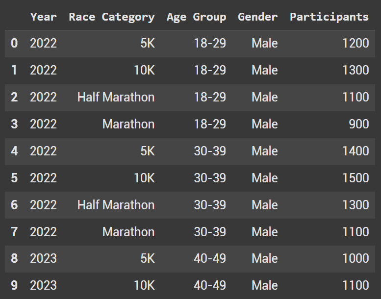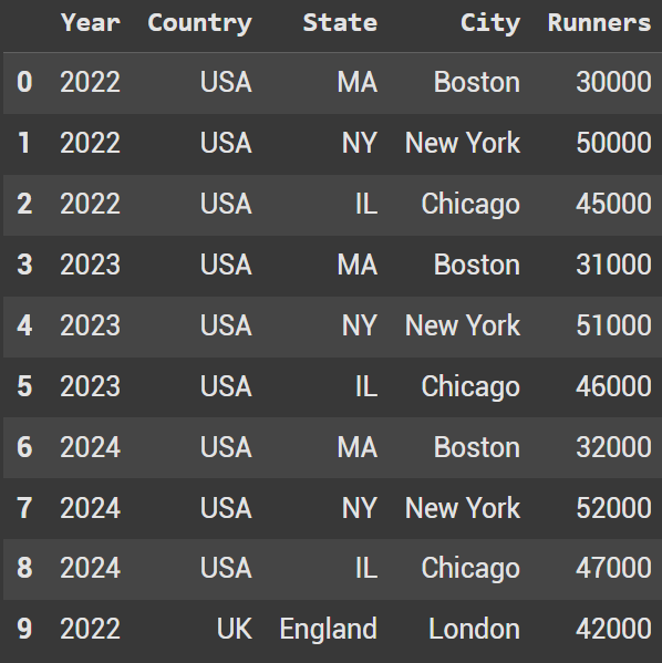 We will be looking at running data for famous races. The dataframe will have Year, Country, City and Runners.