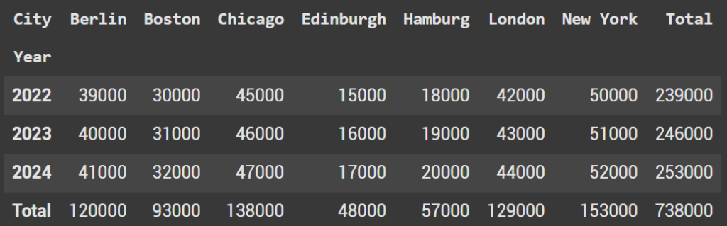 pivot_with_totals = df.pivot_table(index='Year', columns='City', values='Runners', aggfunc='sum', margins=True, margins_name='Total')