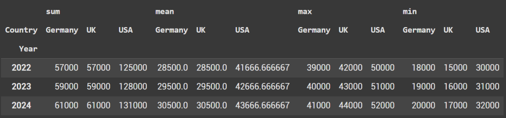 multi_agg_pivot = df.pivot_table(index='Year', columns='Country', values='Runners', aggfunc=['sum', 'mean', 'max', 'min'])