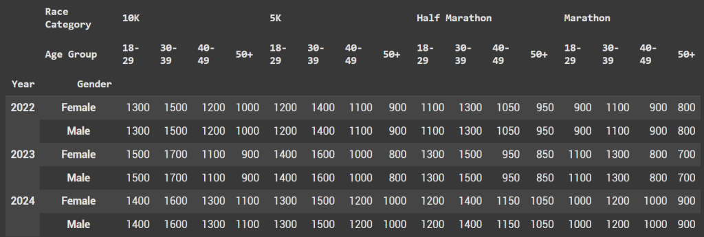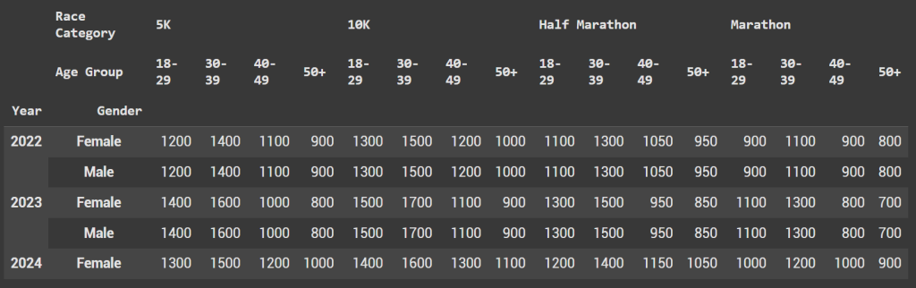 'Race Category': ['5K', '10K', 'Half Marathon', 'Marathon'] * 24,