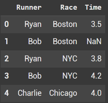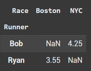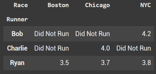 pivot_table_null_values = df3.pivot_table(index='Runner', columns='Race', values='Time', aggfunc='mean', fill_value="Did Not Run")