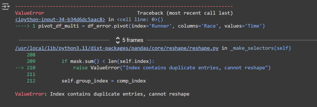 pivot_df_multi = df_error.pivot(index='Runner', columns='Race', values='Time')