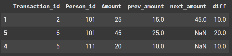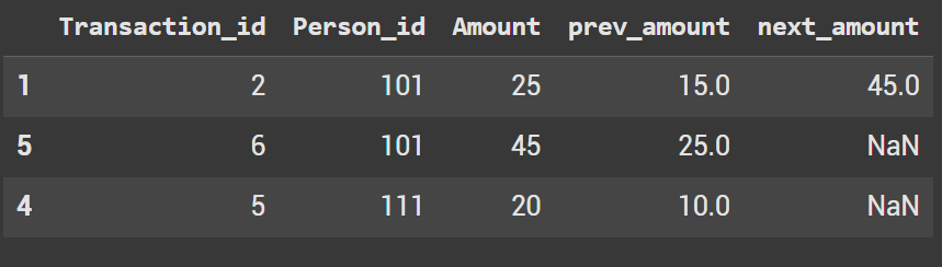 Question: Find transactions where person paid more than last time. In the final dataframe get the previous and next transactions as well.