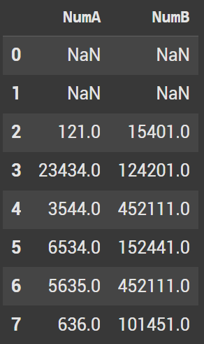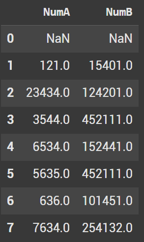 To shift down 1 row, we pass the parameter of 1. This gives our index a value of NaN. The values 121 and 15401 are now in the first index.