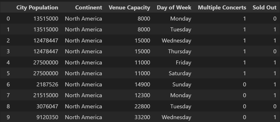 Now we will want to split our data into features and our target variables. Since we want to predict a sold out concert, we will drop this from the features. The features will be represented with X.