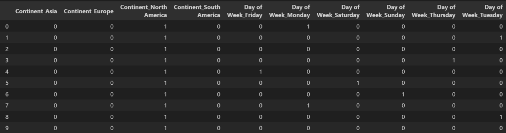 By using dummies, we can create each day of the week and continent as a column with binary results. 1 if it’s that day of the week and 0 for every other day of the week. Same with the continent. We can also achieve this by using One Hot Encoder, but I elected to use get_dummies in this lesson.